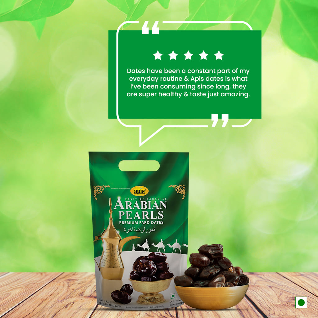 APIS Arabian Pearls dates: The taste of tradition. Carefully harvested and packaged to ensure that they stay fresh and tasty.