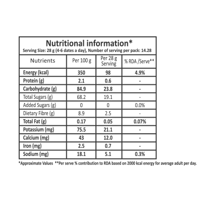 Nutritional Information (Serving size 28g (4-6 dates a day), Number of serving per pack: 14.28)